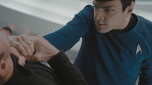 The young captain: Kirk’s arc in this movie is pretty straightforward. He starts out brash and arrogant, and always ready for a fight. But then his conflict with Spock knocks him down a few pegs, so he can emerge as a true leader, and friend to Spock. The part I find interesting is how Captain Pike of the Enterprise sees all this prodigy-like potential in Kirk, almost to the point where Kirk is some sort of “chosen one” or “destined” to be a captain himself.