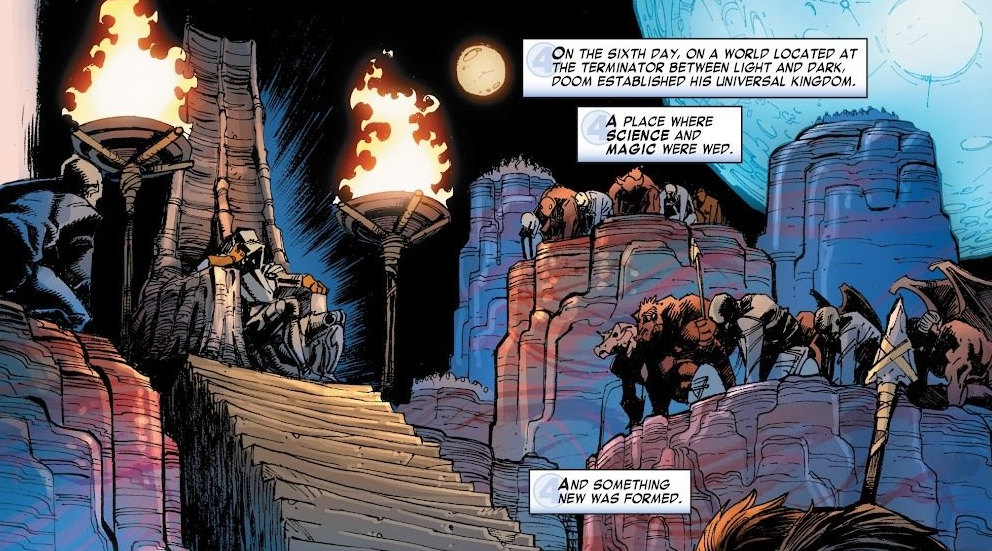 Issue #611 begins with Dr. Doom on the other side of the Bridge, Reed’s portal to other universes, where he’s assembled his own version of the Council of Reeds, the Parliament of Doom. And he now has two Infinity Gauntlets from the Dr. Dooms of the other universes. Doom uses the bridge to find an empty reality and creates his own new universe, a world ruled by equal parts science and magic. He even gives his universe life, populating it with strange creatures.