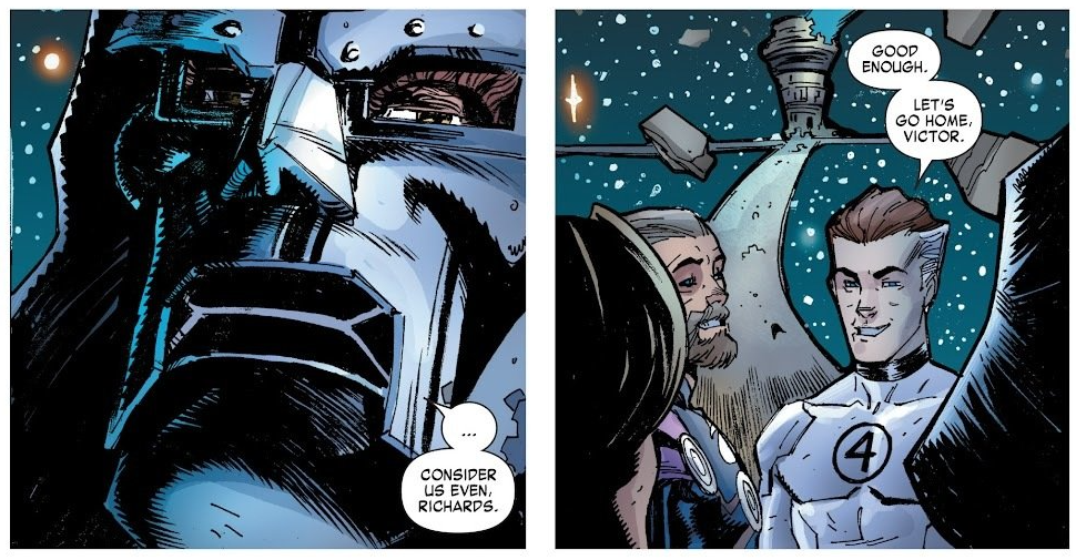 Unstable molecule: While Dr. Doom doesn’t exactly thank Reed as Valeria asked, Reed’s response to Doom is simply “Good enough,” and “Let’s go home.”
