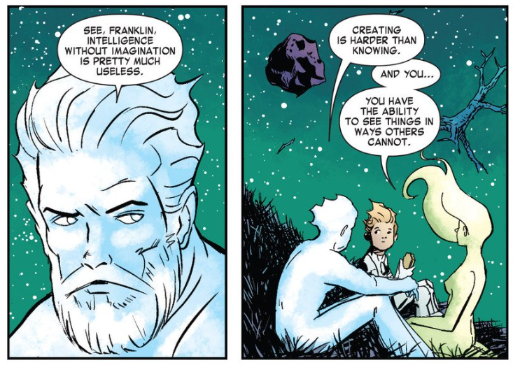 Franklin doesn’t want to show this universe to his sister, but future Franklin tells him not to worry about Valeria being so much smarter than him, because his creativity will someday match her intellect. “Creating is harder than knowing,” he says.