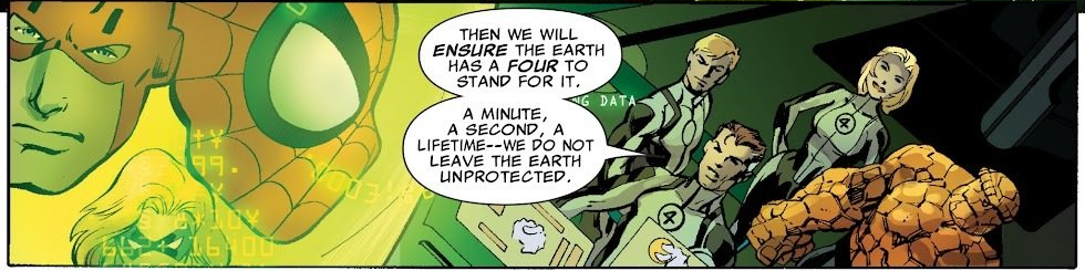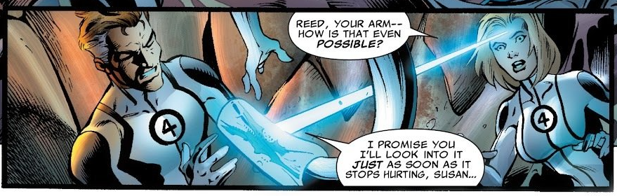 Reed further says that it will be one year for the FF, but only a few seconds for New York. He suggests recruiting four replacements, so that there will still be an active Fantastic Four during those few seconds. Sue asks him if a year-long adventure is wise considering Reed was just injured. Reed answers, “I’m fine. Trust me.”