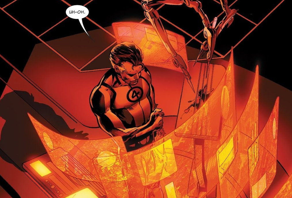 Back in Reed’s think tank, he deduces that the unstable molecules that give him his stretching power have reached cellular entropy. His body is slowly breaking apart. He further deduces that there is nothing in the known universe that can reverse this molecular decay, and that just leaves… unknown universes.