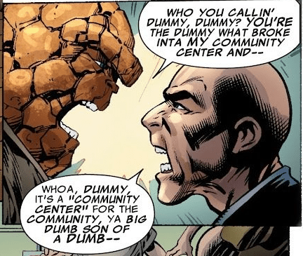Clobberin’ time: The Grimm Youth Center is a leftover story bit from when Ben became super-rich during the J. Michael Straczynski era (era). Another example of Fraction pulling out surprise pieces of continuity.
