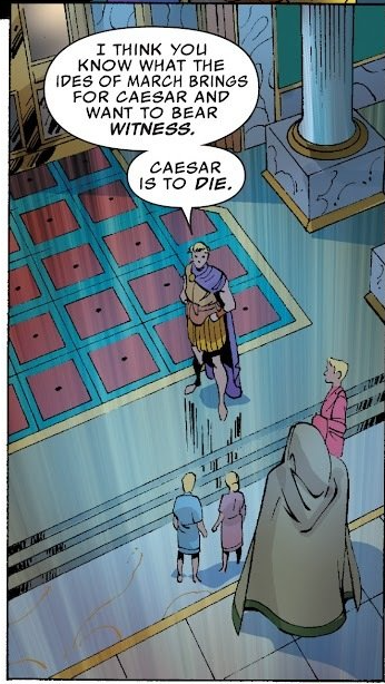 Cut to Julius Caesar, who has had a vision of two black birds killing a white bird. He believes this is a dire omen of his death. Turn the page and there’s Johnny, Ben and the kids, who have come to Caesar in the form of fortune tellers. This is one day before the fateful Ides of March where Caesar was betrayed and murdered. The kids try to warn him of this, just as other fortune tellers and seers have told him. Caesar counters by quoting Shakespeare’s Julius Caesar at them.