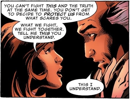 Fade out: Sue has a very harsh line where she says Reed behaves like a human so well that sometimes she forgets “what you really are.” A few pages later, Sue comes around and says, “What we fight, we fight together.” And then she kisses him. Relationships gotta be so complicated.