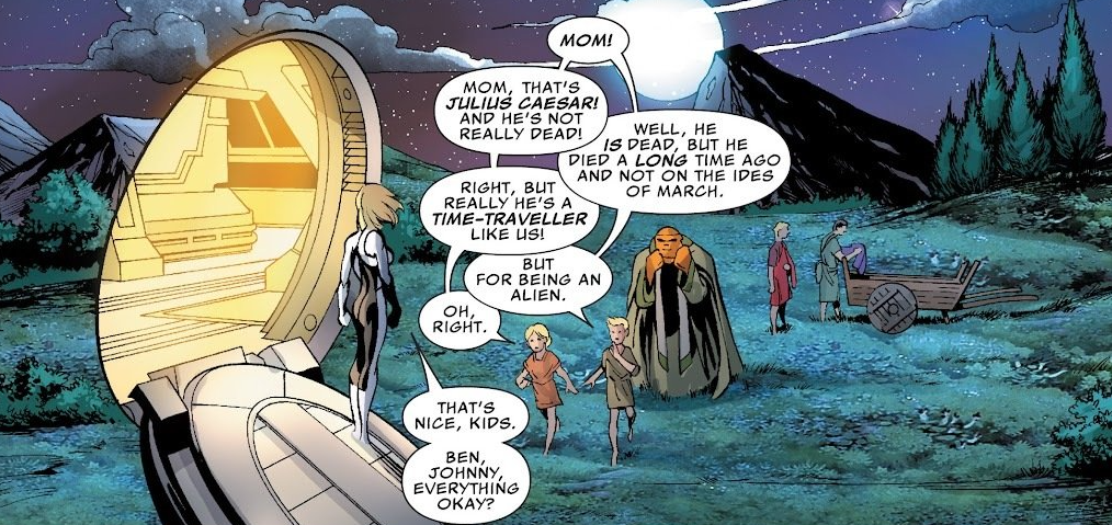 Turn the page, and we see that the ship is cloaked in the air over Rome in the year 44 B.C.E., the time of Caesar. Alone with Reed, Sue tells him that she’ll help him with his condition, but she also does not forgive him for keeping this secret from her. In the next room, Ben, Johnny, and the kids are dressed in ancient Roman costumes to go exploring. Reed and Sue tell the kids are saying they’re staying on the ship for some “mommy-daddy time.”