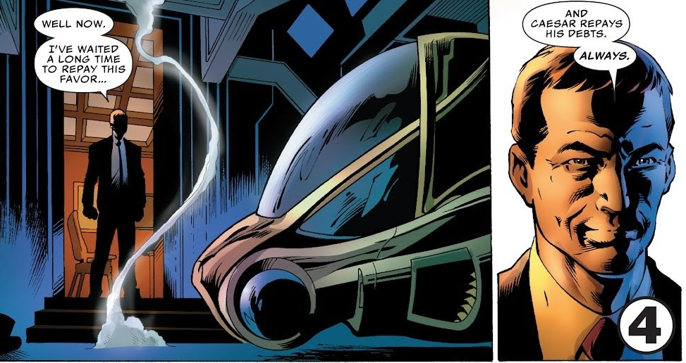 Back at the ship, the FF say goodbye to the alien. Johnny asks about the pirate incident that started this issue, but the alien admits, “It was before my time.” Cut to the present day, where a wealthy man named “Mr. Cotta,” reads an newspaper article about the replacement Fantastic Four led by Ant-Man in the concurrent FF series. (This is the first hint in Fantastic Four that something’s up back on Earth.) Mr. Cotta opens a hidden door in his office to reveal the alien’s ship. Mr. Cotta is really the Caesar alien, he says, “Caesar repays his debts. Always.”