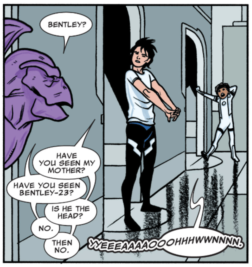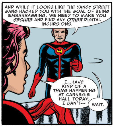 Moving on, the replacement four have a meeting. She-Hulk will take Medusa’s son Ahura back to the Inhuman city of Attilan to search for Medusa and Bentley, while Ant-Man and Darla will work on securing Darla from other cyberattacks. Except that popstar Darla has an engagement at Carnegie Hall that day. (If you’re playing Carnegie Hall, wouldn’t the people you live with know that already?) Darla sees Tong in a dress and says, “Good for her.”