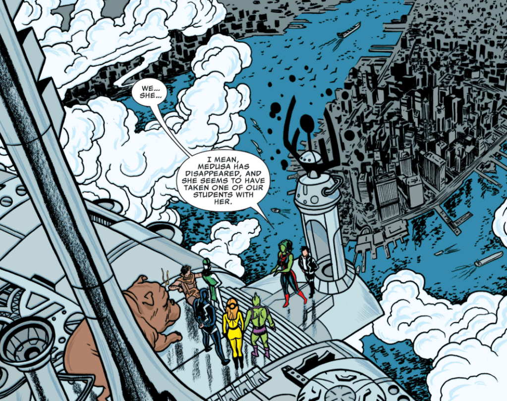 Back at HQ, Dragon Man discovers that the H.E.R.B.I.E. bots tasked with security had been dismantled, with traces of Medusa’s hair left behind. Scott starts to give everyone a pep talk about finding Medusa and Ahura when there’s a big pop, and the entire building is transported to another world. Where are they? The caption reads, “To be continued… in the Negative Zone!”