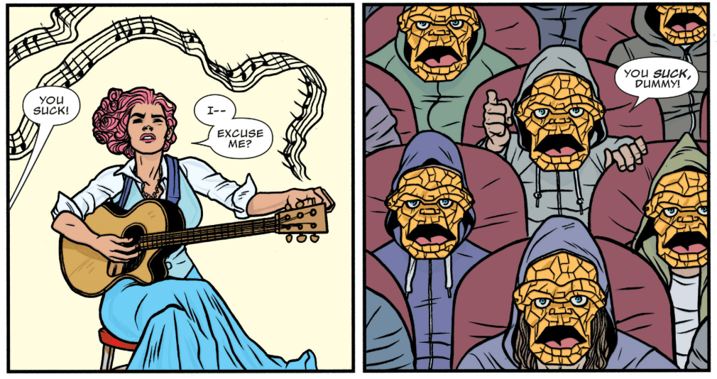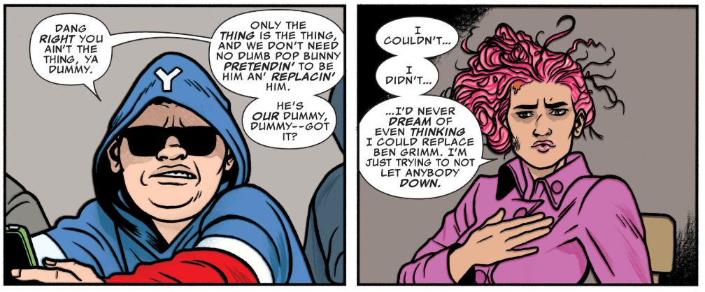 Darla and Scott reunite at the internet café from earlier, where they are confronted by the Yancy Street Gang. Scott knows each of their names, saying he beat them at their own game. During the Carnegie show, he shrunk down to ant size and followed the gang home, learning all their secrets. What’s more he sent out all their personal info onto the internet, including passwords and phone numbers, but also embarrassing photos and posts. The gang again insists that Darla is not the Thing. She agrees with them, saying she isn’t there to replace anyone. Scott tells the gang to go ahead with their pranks because Darla needs to toughen up, but also warns them that Darla will shock the world once she’s in fighting shape.