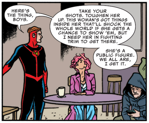 This issue begins with Dragon Man asking around the new Baxter Building where Bentley has gone. This includes a fun full-page cross-section of the HQ in the old Jack Kirby style. Scott Lang, the current Ant-Man, wakes from a dream of his dead daughter Cassie (don’t worry, she eventually comes back), and then obsesses over photos of her on his phone. During breakfast, the whole FF sees pics of Darla in the newspaper, of her trying on various looks for her Thing suit from the previous issue. Turns out someone hacked her phone and stole her pics. Cut to an internet café (!) where a daily bugle reporter is buying the photos from the Yancy Street Gang, who want to make Darla’s life awful for her taking the place of the Thing.