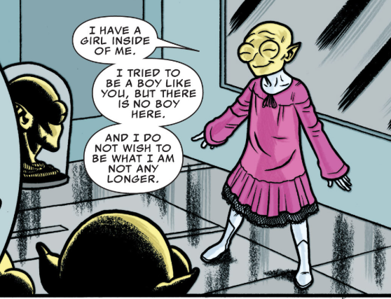And then this happens. There’s no other way to say it, so here goes: the Moloid Tong, wearing a pink dress, comes out as a trans female. But the comic doesn’t use those words. The actual text is, “I have a girl inside of me. I tried to be a boy like you, but there is no boy here. And I do not with to be what I am not any longer.” The other Moloids are happy to accept Tong as their sister.
