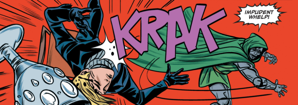 We begin with the new Baxter Building returning to New York from the Negative Zone after last issue’s adventure. Annihilus is on the roof, saying “Finally.” Cut to Latveria, where Alex sees this in the newspaper (The Daily Bugle delivers to Latveria?) and he considers going back home, now that he’s told Doom everything. Doom loses it, throwing a metal goblet at Alex, and telling him that he has no agency of his own now. Doom takes Alex down to caverns beneath Castle Doom where Doom has Alex’s parents held captive. Doom insists that Alex call him “Master” from now on.