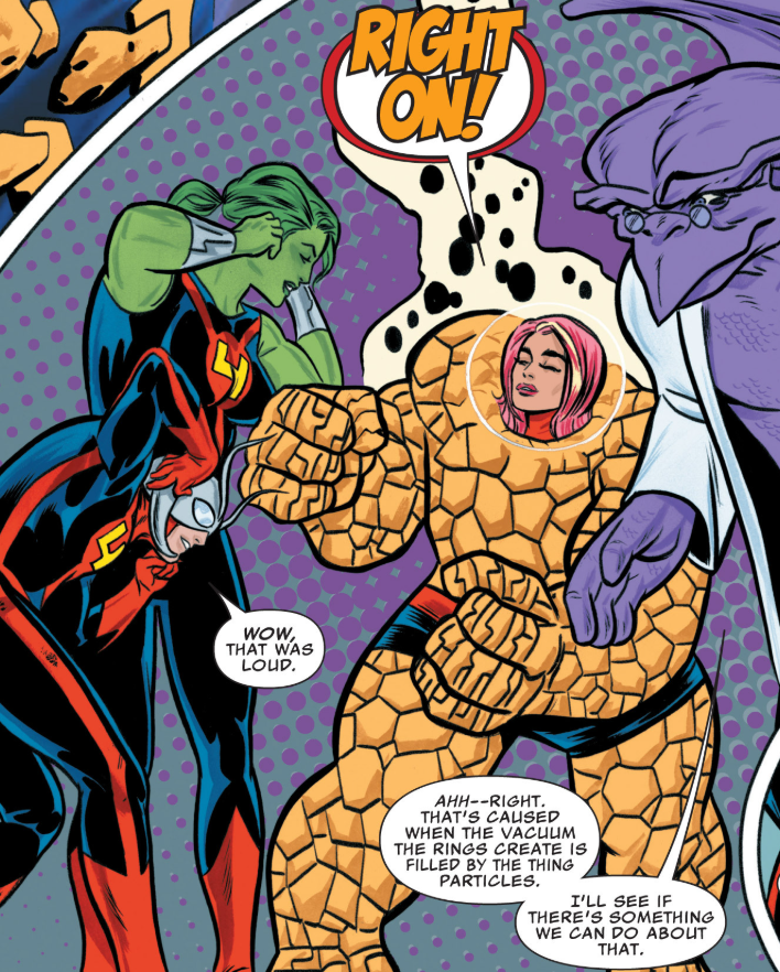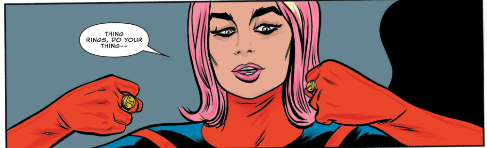 Then there’s something for the true old-school fans. At the Baxter Building Ant-Man and Dragon Man give Darla a pair of rings that we recognize as the ones from the old Thing cartoon. They explain that these can summon her Thing costume to her in an instant, so it’s not so cumbersome. She quotes the classic “Thing Ring, do your Thing,” and it works.