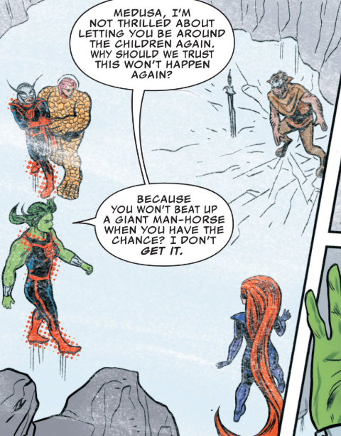 In the Himalayas, the team meets with the Inhumans for a trial of sorts, where they chide Medusa for letting the Wizard exploit a weakness within her (seen the previous few issues). Medusa enacts a ritual where she drops a sword, symbolically dropping the veil of nobility and allowing anyone to speak against her. Gorgon (who, let’s not forget, once singlehandedly defeated the entire Fantastic Four) says all is forgiven, but She-Hulk steps up and says Medusa shouldn’t be around the children anymore after what happened.