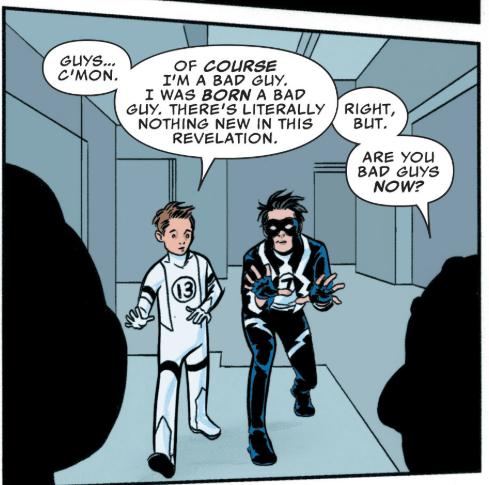 At the Baxter Building, Bentley-23 and Ahura teleport into the place to find it empty. Then soon realize the other Future Foundation kids have set up Home Alone-style traps for them, thinking they are villains. A big slapstick fight breaks out, with the kids asking whether Bentley and Ahura are bad guys now.