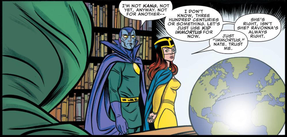 Ant-Man tells She-Hulk and Medusa that Alex Power just returned home. We see him looking beaten and bruised, but welcomed by the Foundation kids. Medusa and She-Hulk agree to go back and check on him. At the Baxter Building, John Storm wakes from unconsciousness, crying “Doom!” In Latveria, Dr. Doom meets with Kid Immortus, a version of Kang from three hundred centuries in the future, and a woman named Ravonna. Kid Immortus says everything is going according to plan. As such, Annihilus appears, revealing that the Negative Zone plot of the last few issues was all part of Doom’s plan to get Annihilus to Earth. (Remember John Storm’s warning from the future, that Doom will eventually gain the powers of both Kang and Annihilus.) Kid Immortus says this is “the beginning of the end.”