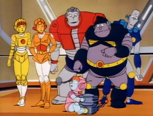 There’s so much going on here, it’s hard to know where to begin. First, the five robots. Tor is the strong one, a self-confident blowhard. Bort is the shape-changer, who is not cowardly, but – let’s say – hesitant to go into battle. Bo and Boo are the two girls, both with flirty and playful personalities. Bo can cast illusions, which doesn’t come up much, while Boo has the sci-fi/fantasy cliché of controlling the air/water/fire/earth elements, potentially making her the most powerful one. Then there’s Crunch, who is a, ahem, chubby robot with the power to eat anything. I dislike the “fat guy who’s always eating” character seen in so many old cartoons, but Mighty Orbots skirts around this by having Chunk be a “disposal unit” who converts everything he eats into energy for the team. He’s goofy comic relief, but he serves a purpose.