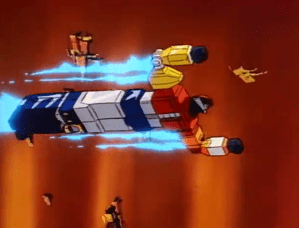 Yes, it’s the ol’ five-robots-combine-to-one-big-robot thing. You’ve seen Voltron, you’ve seen Power Rangers, you’ve seen… okay, I can only think of those two. But I’m certain there are others. What’s interesting is that when combined into one robot, each of the five maintains their voice and can access their individual superpowers. This makes the big battles interesting, with different ways to mix it up.