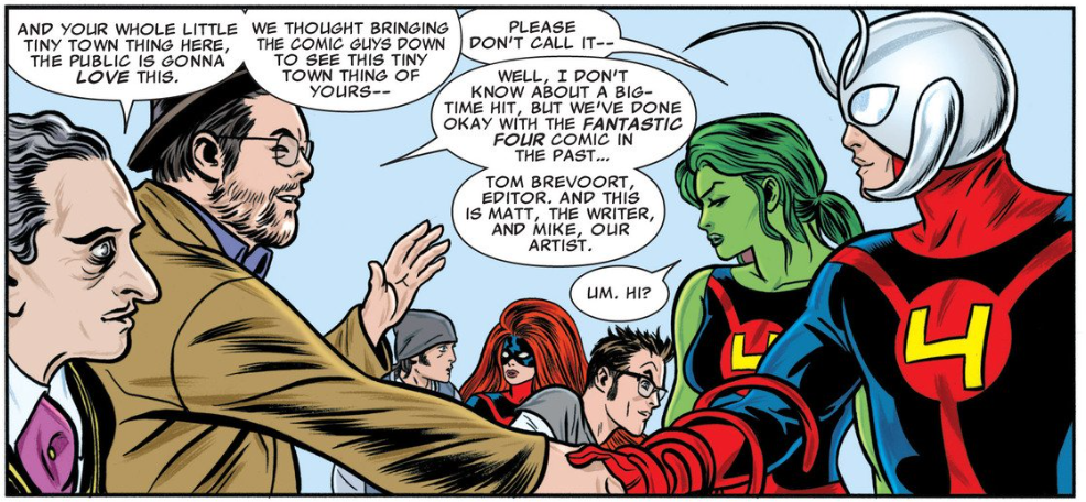 We begin with everyone around the dinner table at, as John Storm says he can sense Dr. Doom’s presence in Alex. A fight almost breaks out. In the bathroom, Alex contacts Dr. Doom, who tells him John Storm has to be killed (!), reminding Alex that Alex’s parents’ lives are in the balance. Cut to the Franklin Park Zoo, where the new team and some of the kids are having a PR meeting with three representatives of Marvel Comics, writer Matt Fraction, artist Mike Allred, and editor Tom Brevoort, the same ones making this issue. It’s meta! The heroes are taking the Marvel guys on a trip through the microverse in Ant-Man’s shrinking ship. Ant-Man assures everyone the trip will be safe, but then he seems unsure of it.