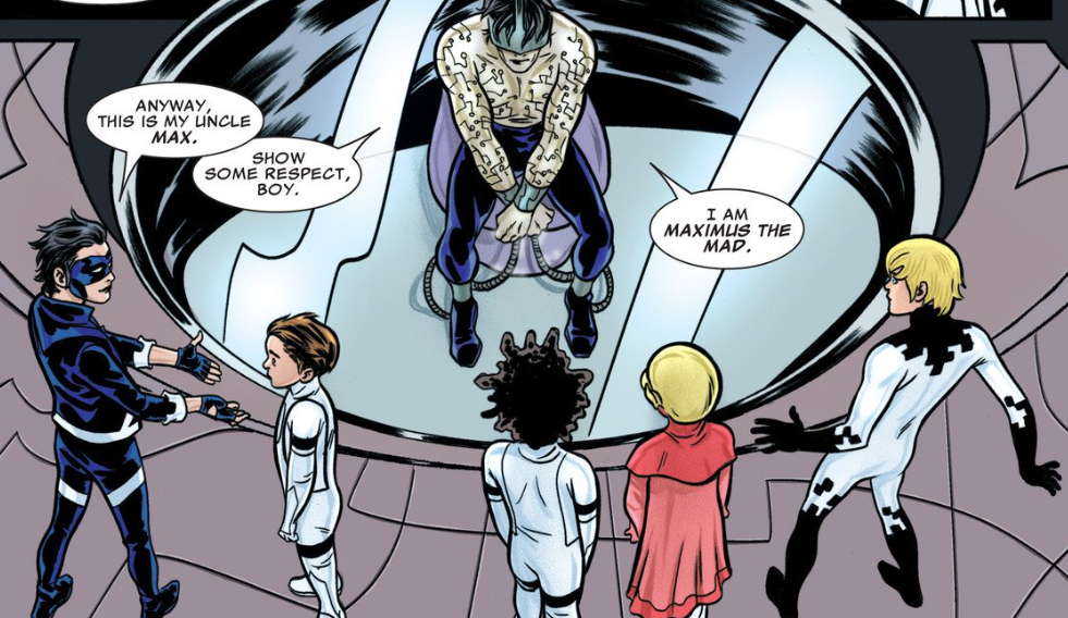 Ahura takes some of the Foundation kids to the floating city of Attilan. Specifically, it’s him, Alex, Bentley-23, Onome, and Tong the Moloid. They meet with a mystery man whose eyes are hidden behind a metal blindfold. He seems to know about each of them. Ahura reveals this is his uncle, Maximus the Mad. He’s in a cell, and Maximus engages the kids in a game of twenty questions in exchange for them letting him go free.