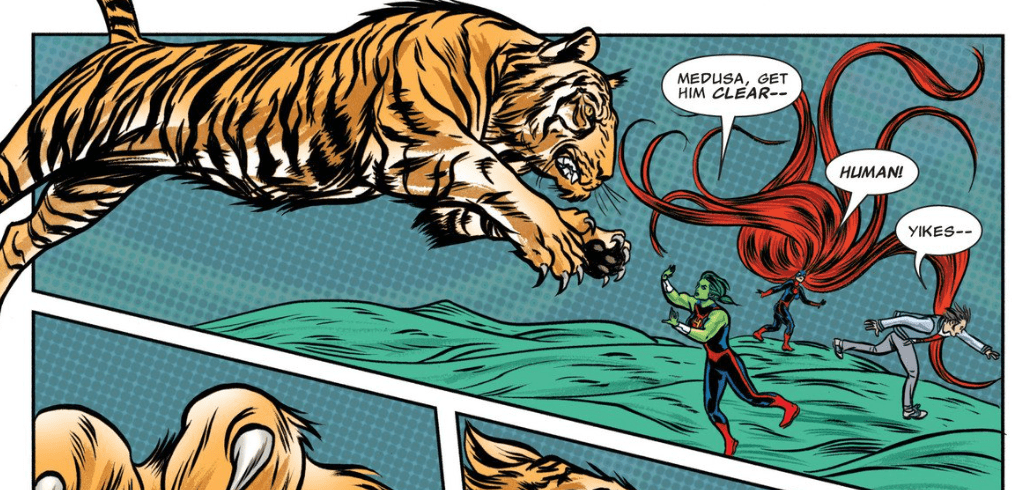 Medusa is unimpressed with the tiger’s size, saying she’s faced bigger beasts. I’m feeling a little tired this week, so I’ll let you comb through all of Marvel history to find out what giant beasts she’s fought in the past.