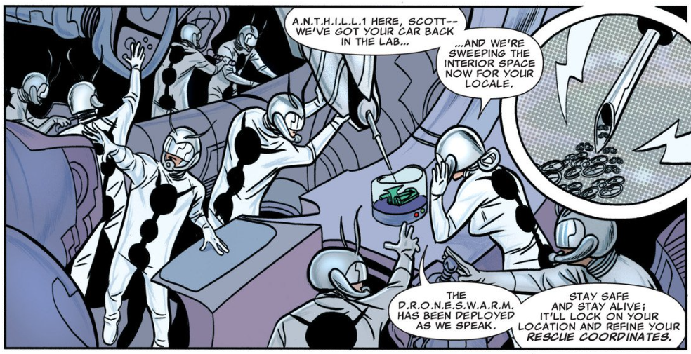 Fantastic fifth wheel: Throughout this issue, Ant-Man communicates with a place and/or organization called A.N.T.H.I.L.L.1. We get one glimpse of this, an entire team of people wearing black and white Ant-Man gear. The Marvel Wiki has no information on A.N.T.H.I.L.L.1., except to note that this is its first appearance. I’ll assume this is also the last appearance.