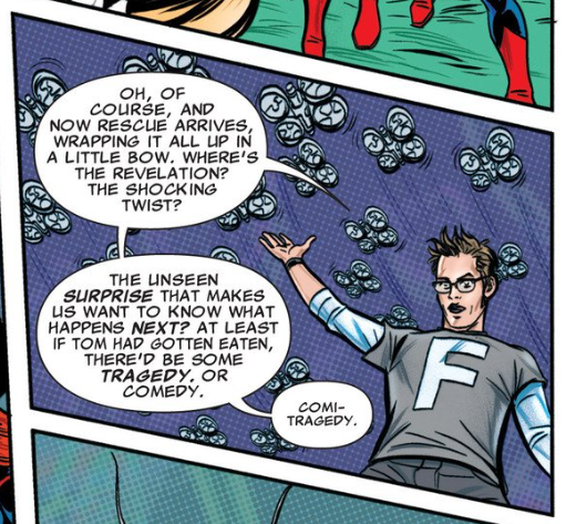 The heroes and the Marvel guys venture outside the ship, looking for the tiger, who has run off. The find it, only to discover it has grown to giant size, or at least giant from their perspective. They fight the tiger while keeping the Marvel guys out of harm’s way. Ant-Man says this will be a fine ending for the comic, but Matt Fraction doesn’t buy it. He says there has to be some sort of unseen surprise at the end. Ant-Man responds, “We’re the FF. Something will come up.”