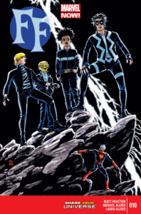 There’s so many plotlines happening, it’s getting harder and harder to recap. The Fantastic Four went on a journey throughout time and space, leaving behind a replacement Fantastic Four – Ant-Man, Medusa, She-Hulk, and newcomer Darla Deering – to run the Future Foundation in their place. They disappeared, leaving the new team on their own. An older Johnny Storm, now known as John Storm, arrived from the future with a tale of an all-powerful Dr. Doom, called the Conquering Doom, who killed the Fantastic Four in the distant future. Plans are under way to rescue them. But then, present-day Dr. Doom has made a deal with Alex Power to spy on the new FF, holding Alex’s parents hostage. I think that covers it for now.