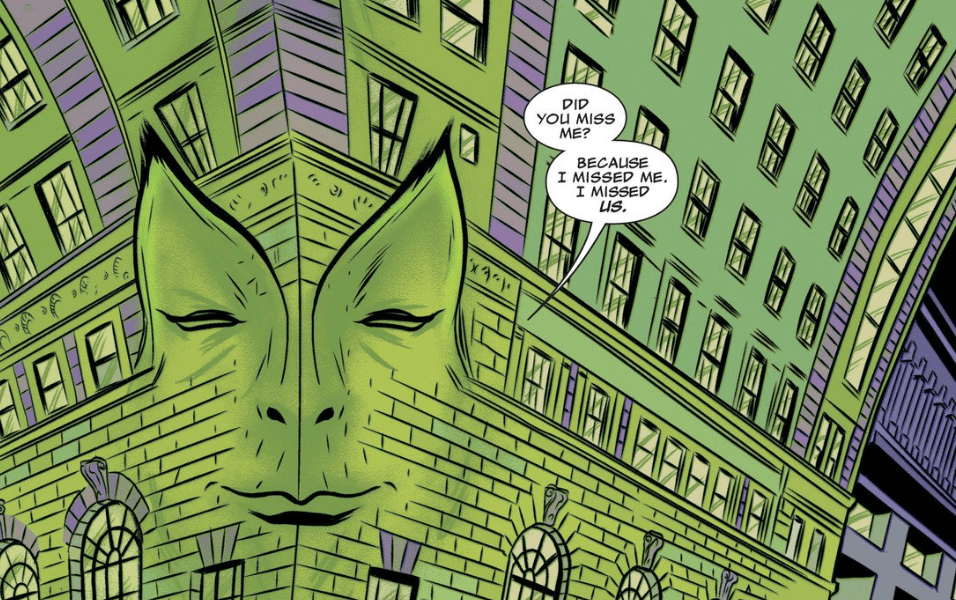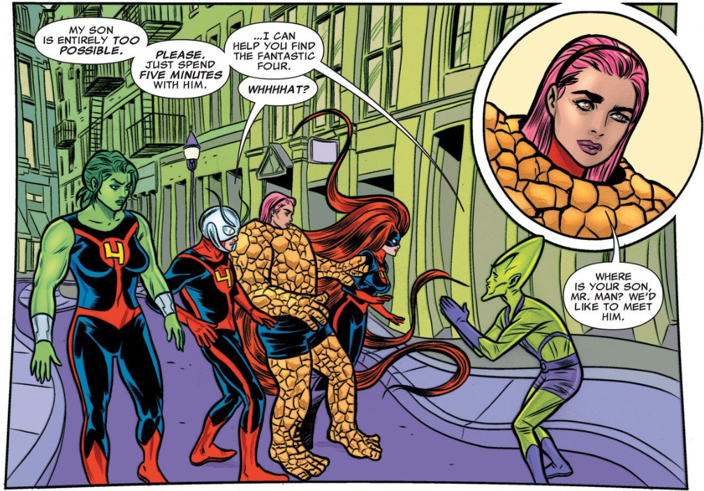 The replacement four arrive in the past, only to find NYC turned all green and purple, and seemingly abandoned. Everything gets all twisty-turny until the face of the Impossible Man appears on the side of a building, asking “Did you miss me?” There’s a brief fight, after Impy says he pulled them there as soon as they were unmoored from time, because he has request. He’s heard they run a school now, and he has a kid who needs help.