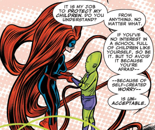 The heroes dismiss the idea, saying the Future Foundation is not a conventional school, but one with a specific curriculum for specific types of students. Impossible Man says his son needs help because the boy is “entirely too possible.” He offers to help them find the missing Fantastic Four in exchange for meeting the kid. They go to this New York’s library and they’re introduced to the impossible boy, who is impossibly named Adolph.