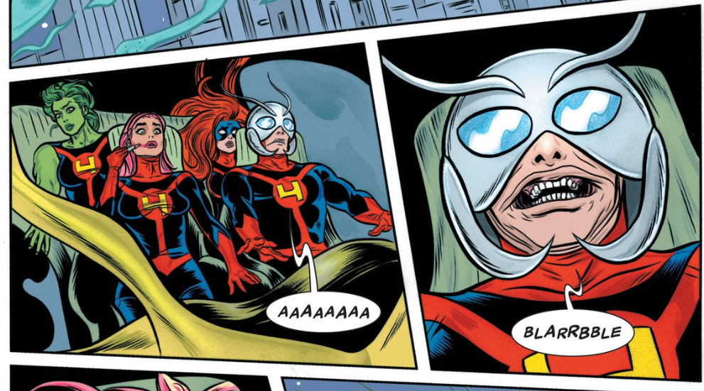 The replacement four arrive in the past, only to find NYC turned all green and purple, and seemingly abandoned. Everything gets all twisty-turny until the face of the Impossible Man appears on the side of a building, asking “Did you miss me?” There’s a brief fight, after Impy says he pulled them there as soon as they were unmoored from time, because he has request. He’s heard they run a school now, and he has a kid who needs help.
