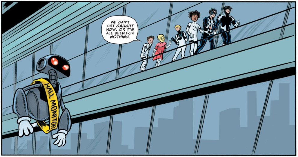 Multiple H.E.R.B.I.E. robots patrol the hallways of the Baxter Building wearing “hall monitor” sashes. Freakin’ H.E.R.B.I.E. the robot.