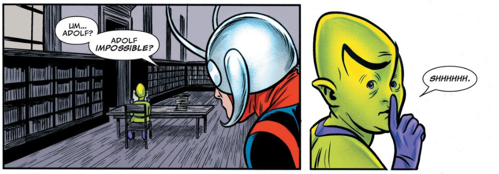 The heroes dismiss the idea, saying the Future Foundation is not a conventional school, but one with a specific curriculum for specific types of students. Impossible Man says his son needs help because the boy is “entirely too possible.” He offers to help them find the missing Fantastic Four in exchange for meeting the kid. They go to this New York’s library and they’re introduced to the impossible boy, who is impossibly named Adolph.