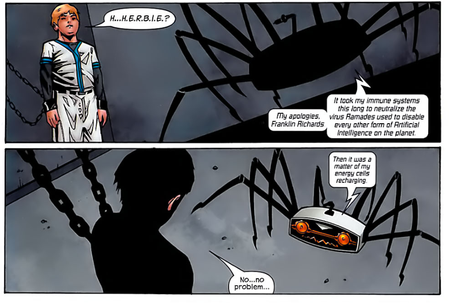 And, yes, Reed has built a new version of H.E.R.B.I.E. the robot. This one is humanoid, complete with legs. Later, when his head is removed, his head sprouts spider legs so he can get around. Freakin’ H.E.R.B.I.E. the robot.