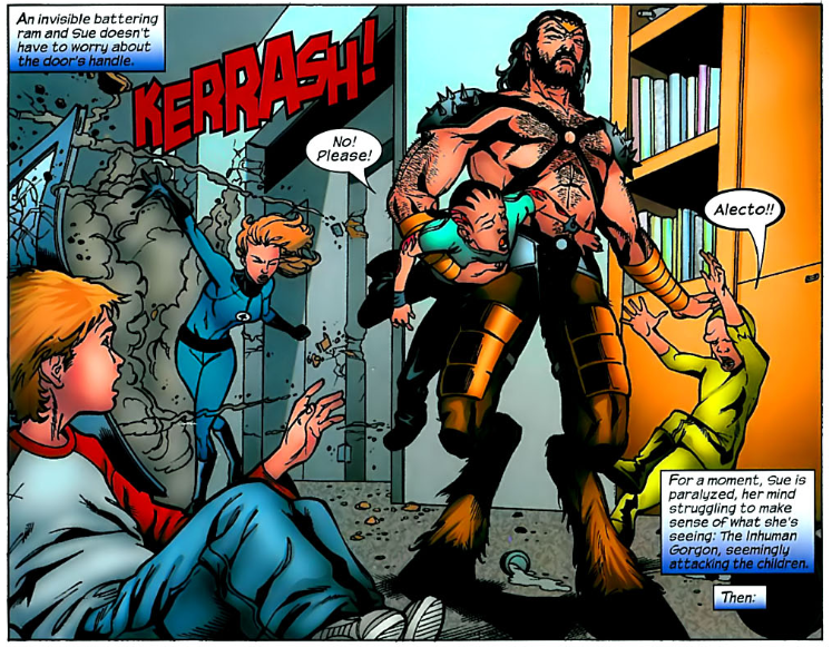 The next story arc begins with Inhumans, where Gordon’s daughter Alecto and her friend Renyo steal a spaceship and travel from the moon to the Earth. They fly straight to FF headquarters to ask for help. They’re terrified of something in the Inhumans’ city of Attilan, but they won’t say what. Gorgon (who, let’s not forget, once singlehandedly defeated the entire FF) shows up for kids, and he and Sue fight. Turns out the two kids have a romance going, but they can’t be together because they’re from two different castes.