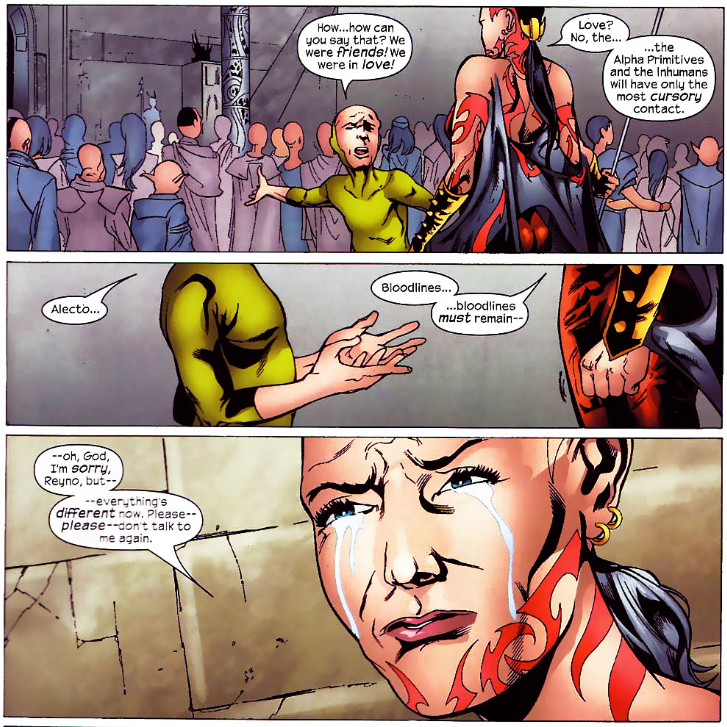 Fantastic fifth wheel: Crystal and Medusa catch the reader up on Renyo and Alecto, the two Inhuman teens who had a doomed romance a few issues back. Turns out the romance is back on. Not only have Renyo and Alecto reunited, but they’ve run off to the dark side of the moon (heh) to start a new life together.