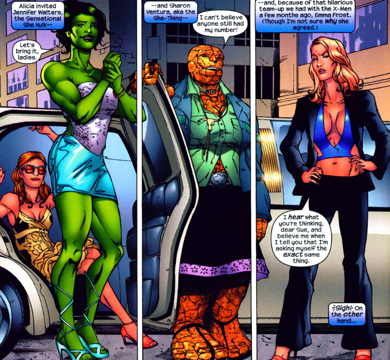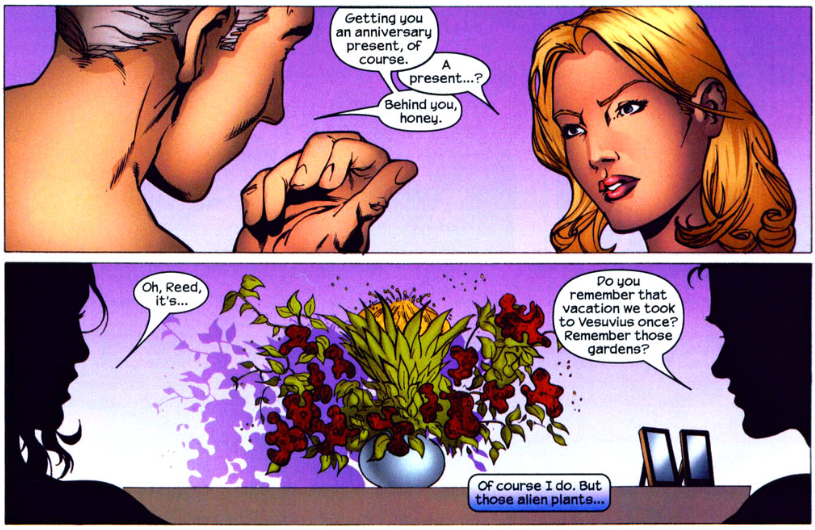 The next storyline is Reed and Sue’s anniversary, except Reed is unexpectedly called away. Instead, it’s a night on the town with Sue and her girlfriends – Alicia, She-Hulk, Sharon Ventura (!), and Emma Frost of the X-Men (!!!). Sue says she’s never cheated on Reed, but Alicia says there was something going on between her and Black panther. There’s a flashback to the FF’s meeting with the Panther, where he takes her on a tour of Wakanda one night while everyone else is sleeping, and things do a get a little steamy. She goes back to Reed in the end, though. The flashback ends with Reed surprising Sue with her anniversary gift, flowers from another planet, and this is why he was gone all day.