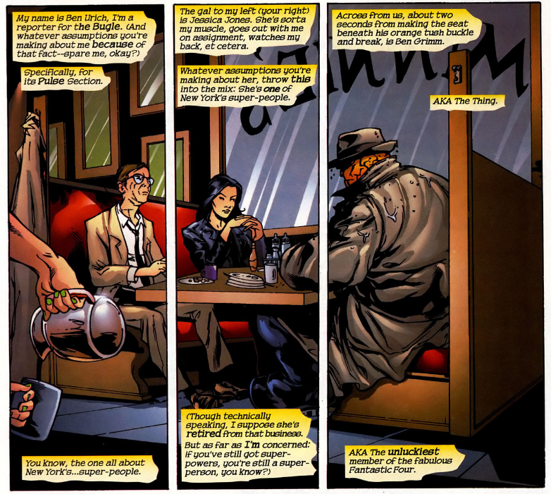 The next story begins with reporter Ben Urich and private eye Jessica Jones recruiting Ben to investigate murders on Yancy Street, committed by a rock monster of some kind. Turns out it’s an ancient golem, brought back to life after being awakened by construction. Ben, with his Jewish background, befriends the monster and offers it a new home, lurking at the bottom of the East River.