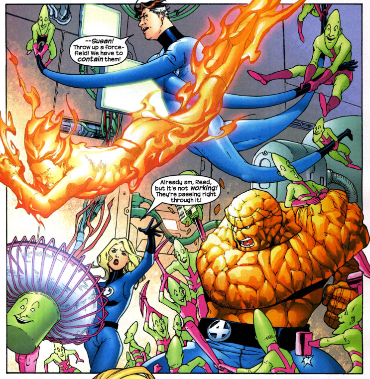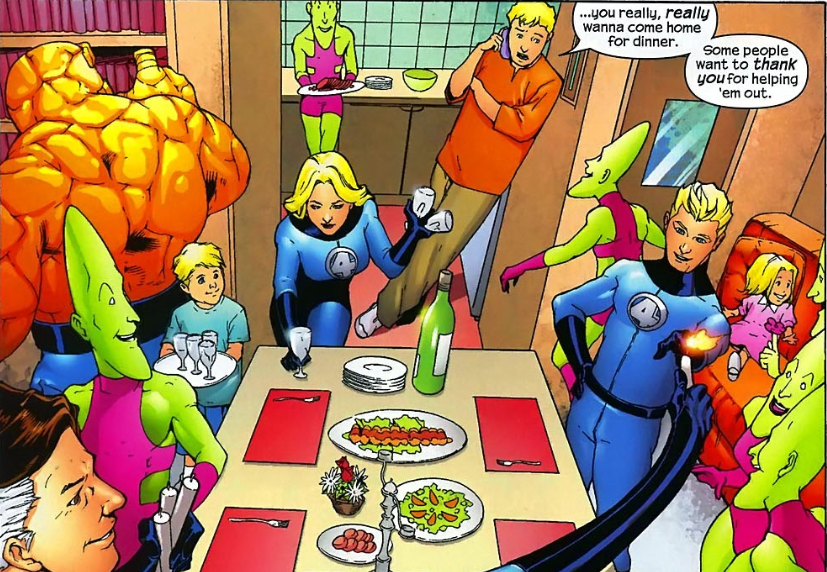 Reed is then contacted by mobster Hammerhead, who says the FF were scammed out of their fortune by Terry Giocometti, who recently stole his fortune as well. Johnny, with no acting gigs to be found, once again begins training as a NYC firefighter. Then there’s several issues of the family going on a camping trip, where the encounter an alien who is the true source of the Jersey Devil urban legend. They defeat the alien, and this is a romantic/bonding moment for Reed and Sue.