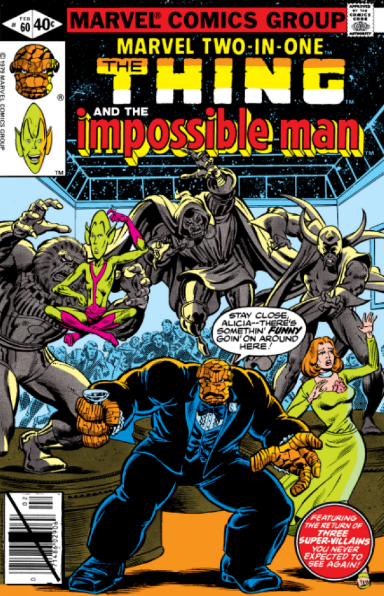 Tracking the history of Impossible Man is even trickier, since the character is so often used for parody and fourth wall-breaking stories. The tale of him creating Impossible Woman by cloning himself was told in Marvel Two-In-One #60. Their children, known only as the Impossible Kids, first appeared in Marvel Two-In-One #86, and were prominently featured in the Impossible Man Summer Vacation parody comic.
