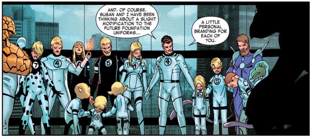Later, Valeria is trying to teach complex mathematics to the other Future Foundation kids. She’s frustrated in their lack of interest, and she’s momentarily distracted as future Franklin pokes his head in to wave goodbye. He then shares a drink with Ben and Johnny, as his way of saying goodbye to them as well. He then says goodbye to Reed and Sue, saying there will be repercussions if he stays longer. Reed and Sue ask if they were good parents to him. He says they were perfect, and then he disappears. The last page is young Franklin leaping through the pocket dimension door in his closet for another adventure.