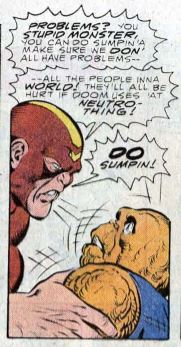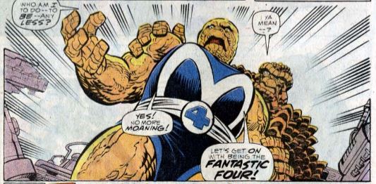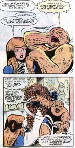 Still in the fight, Doom grabs Crystal by the neck, saying it’s her life in exchange for his freedom. Black Panther says Doom may leave the building under his protection, but after this they’re enemies again. Doom departs, and Ben and Sharon have a heart-to-heart. She says that even though her body is horribly mutated, she still has her mind, and her honor. Sharon promises “No more moaning!” (We’ll see about that.) Then she says it’s time to get on with being the Fantastic Four.