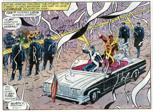 The Fall of the Mutants was an epic X-Men crossover, in which the X-characters didn’t actually cross over with one another. (If I were more cynical, I might almost think that Marvel slapped a crossover logo on covers of a bunch of otherwise unrelated comics to sell more copies. Marvel wouldn’t do that, would they?) In Uncanny X-Men, the X-Men died fighting demons (there are more demons in X-Men lore than you’d think). Except they didn’t really die, and instead got a top-secret new headquarters in Australia. In New Mutants, there was a lot of sitcom-type humor as the teen heroes helped the alien-like Bird Brain explore life on Earth. The real action took place in X-Factor, where the reunited original five X-Men had their first-ever battle against Apocalypse (his first appearance) and then dropped the they’re-pretending-to-be-evil-mutant-hunters-to-secretly-rescue-mutants storyline. After saving New York from Apocalypse, the city gave X-Factor an old-timey ticker tape parade! Along the way, Incredible Hulk, Power Pack, Captain America, Daredevil, and, yes, Fantastic Four had tangential tie-in issues. All you really need to know for this FF issue is that X-Factor is getting a parade, and you’re good.