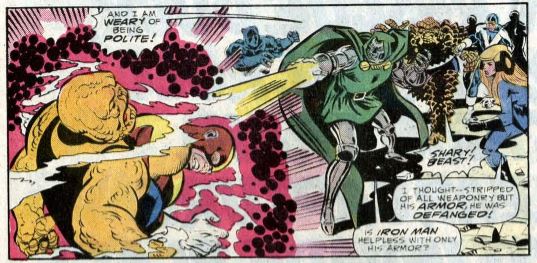 The Stormtroopers retreat, and Doom reveals why he came to New York: He wants to recruit X-Factor to help him reclaim the Latverian throne. X-Factor turns him down immediately (what on Earth made Doom think they’d want to join him?), so Doom retaliates by trapping Sharon and Beast in an energy field shaped like a big fist (comics!). Doom escapes into the sewers, and the heroes pursue him.